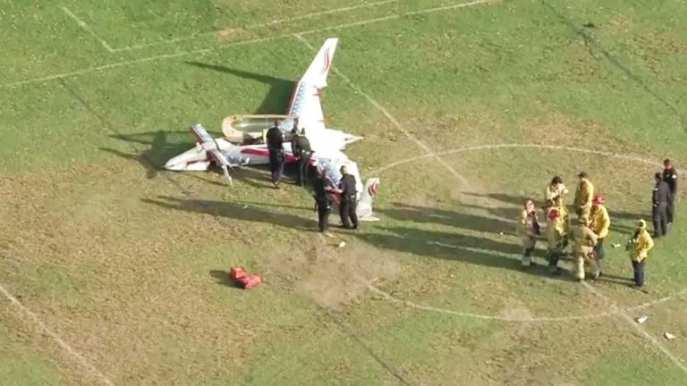যুক্তরাষ্ট্রের ক্যালিফোর্নিয়ায় একটি ফুটবল মাঠে ছোট একটি বিমান বিধ্বস্ত হয়েছে। এতে দুজন আহত হয়েছেন, যাদের স্থানীয় হাসপাতালে ভর্তি করা হয়েছে। চিকিৎসকরা জানিয়েছেন, তাদের অবস্থা মাঝারি হলেও স্থিতিশীল।