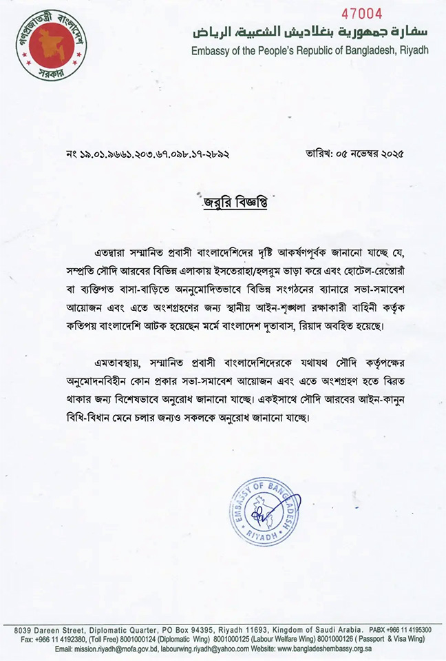 দূতাবাস আরও জানায়, সৌদি আরবে যে কোনো ধরনের সভা-সমাবেশ আয়োজন বা অংশগ্রহণের জন্য কর্তৃপক্ষের অনুমতি বাধ্যতামূলক। আইন লঙ্ঘন করলে শাস্তির মুখে পড়তে হবে। তাই কোনো অননুমোদিত কার্যক্রমে অংশ না নিতে প্রবাসীদের অনুরোধ জানানো হচ্ছে।