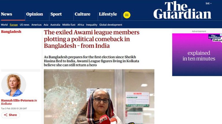 গার্ডিয়ান লিখেছে, নির্বাসিত আওয়ামী লীগ নেতাদের প্রত্যাবর্তনের পরিকল্পনা নির্ভর করছে আসন্ন নির্বাচনের সাফল্য-ব্যর্থতার ওপর। তাদের দাবি, এ নির্বাচন দেশে স্থিতিশীলতা বা শান্তি আনবে না, আর শেষ পর্যন্ত মানুষ আবার আওয়ামী লীগের দিকেই ফিরবে।