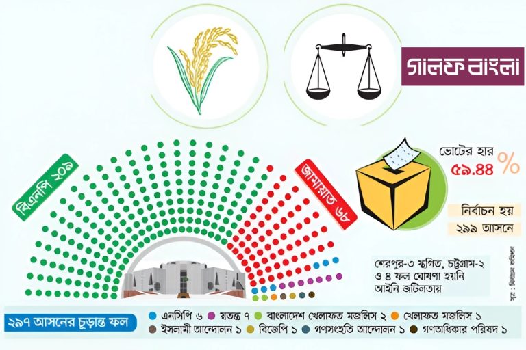 ২৯৭ আসনের ফলাফল : বিএনপি ২০৯, জামায়াতে ইসলামী ৬৮, জাতীয় নাগরিক পার্টি (এনসিপি) ৬, বাংলাদেশ খেলাফত মজলিস ২, ইসলামী আন্দোলন বাংলাদেশ ১, গণঅধিকার পরিষদ ১, বাংলাদেশ জাতীয় পার্টি (বিজেপি) ১, গণসংহতি আন্দোলন ১, খেলাফত মজলিস ১ ও স্বতন্ত্র ৭টি আসন পেয়েছে।