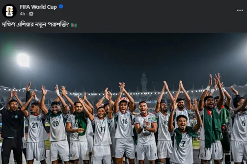 ফেসবুকে বাংলাদেশ ফুটবল দলের একটি ছবি পোস্ট করেছে ফিফা। আর ছবির ক্যাপশনে লিখেছে, ‘‘দক্ষিণ এশিয়ার নতুন পরাশক্তি?’’ এরপর বাংলাদেশের পতাকার ইমোজি দেওয়া হয়েছে।
