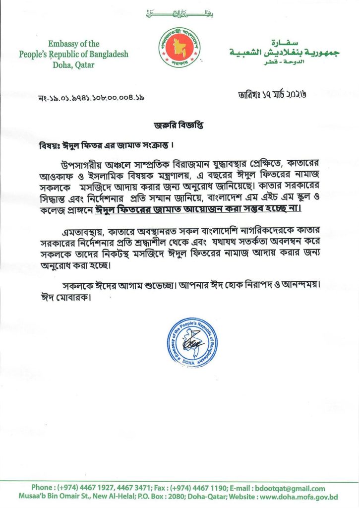 মধ্যপ্রাচ্যে সংঘাতের প্রেক্ষাপটে কাতারে বসবাসরত প্রবাসী বাংলাদেশিদের ঈদুল ফিতরের নামাজ নিকটস্থ মসজিদে আদায় করার আহ্বান জানিয়েছে দোহার বাংলাদেশ দূতাবাস।